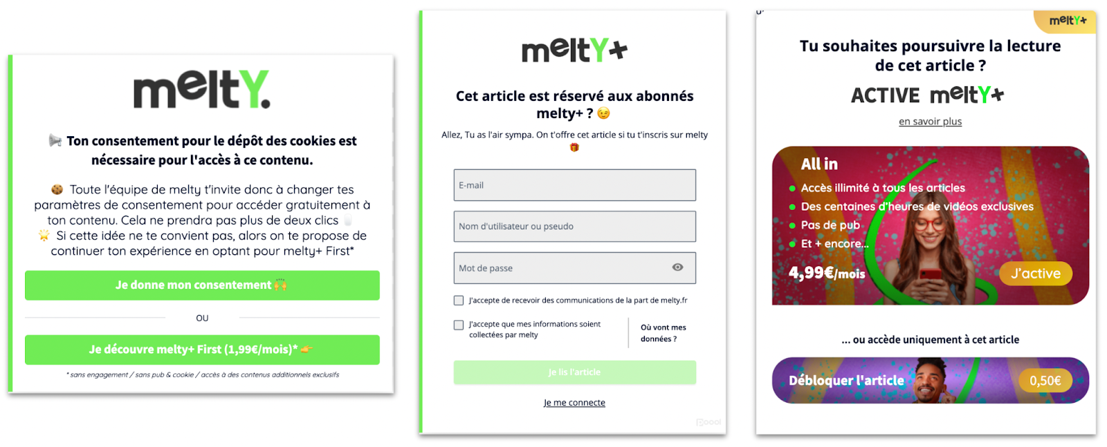 Just look at our clients Melty, who started working with Poool with no conversion strategy but now employ a cookie wall with alternatives, registration wall and paywall to monetize readers at every step of the funnel.