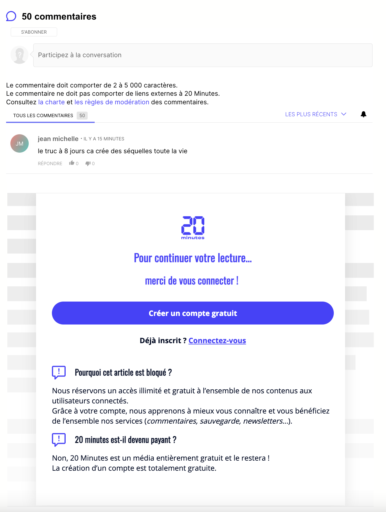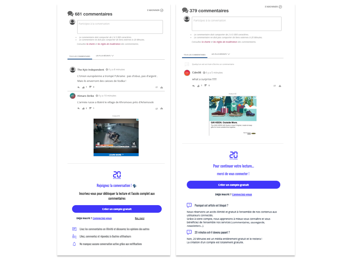 Prior to Poool, 20 Minutes asked for registration at the moment when a user tried to add their own comment. However, given the recent partnership between Poool and Viafoura, the online community engagement platform, and tech solution used for 20 Minute’s comment section, the team were keen to test a registration wall on this user generated content.