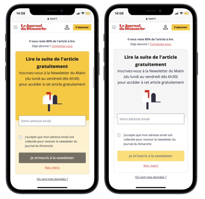 Here, two scenarios were tested. On the left, a newsletter registration wall as a first step before the paywall. The hypothesis here is that the first wall increases engagement and allows the publisher to identify the user, learning about their behavior in order to present them with a journey that is most likely to convert. As a control, we have B which is just a paywall alone.