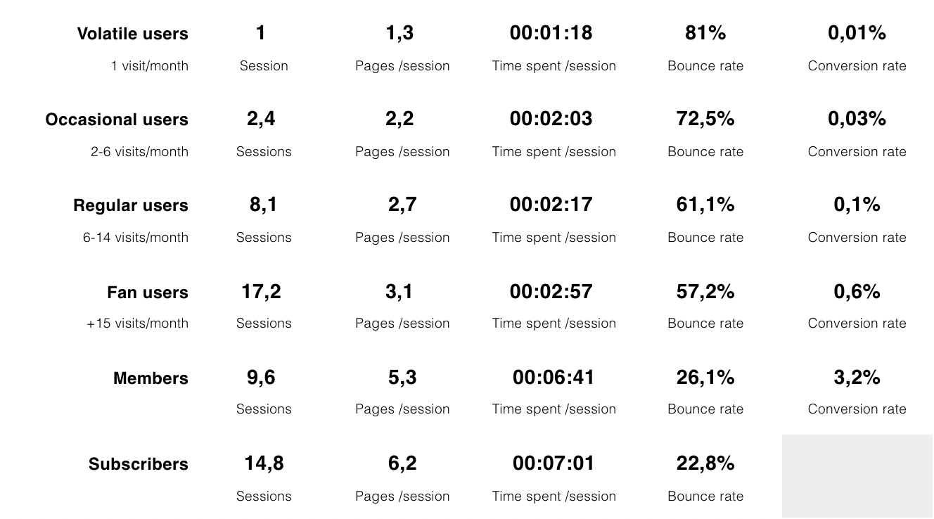 For the subscription business model, the concept of user engagement will be essential. Once again, measuring engagement will be specific to each publisher and to what publishers have already noticed. For some, the switching point from a volatile to an engaged user is more linked to frequency, for others it's connected to the depth of the visit itself.