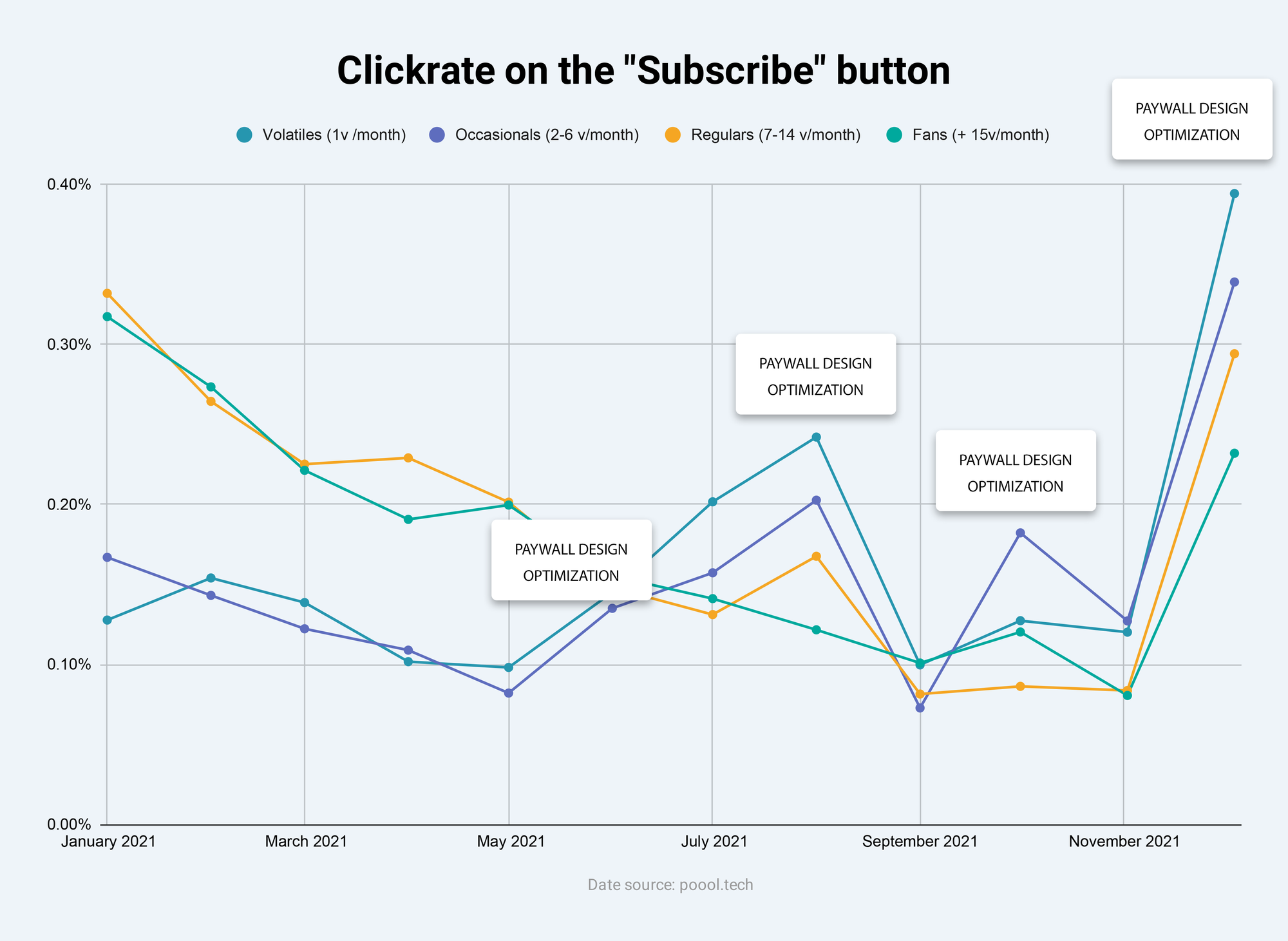 After providing audience conversion strategy consultancy for digital publishers for over 10 years, it's become clear that continuous optimization is essential for wall success. This is particularly the case for paywall designs, where even a slight change can reignite click-through rates and avoid reader fatigue, as the graph below (from real data) demonstrates.