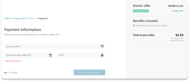 After having converted your users via a paywall using Access, you can then put Subscribe to work in building the remainder of the conversion funnel, from the offers page to payment and confirmation, before being able to manage your growing list of subscribers in the Dashboard itself.