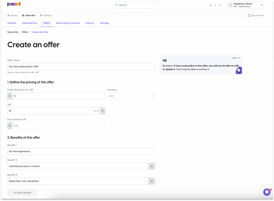 Creating an offer couldn’t be simpler. Just head to the ‘Offer’ section of Subscribe, then ‘Create an offer’. You’ll need to specify the offer name, cost and key benefits then you’re good to go.