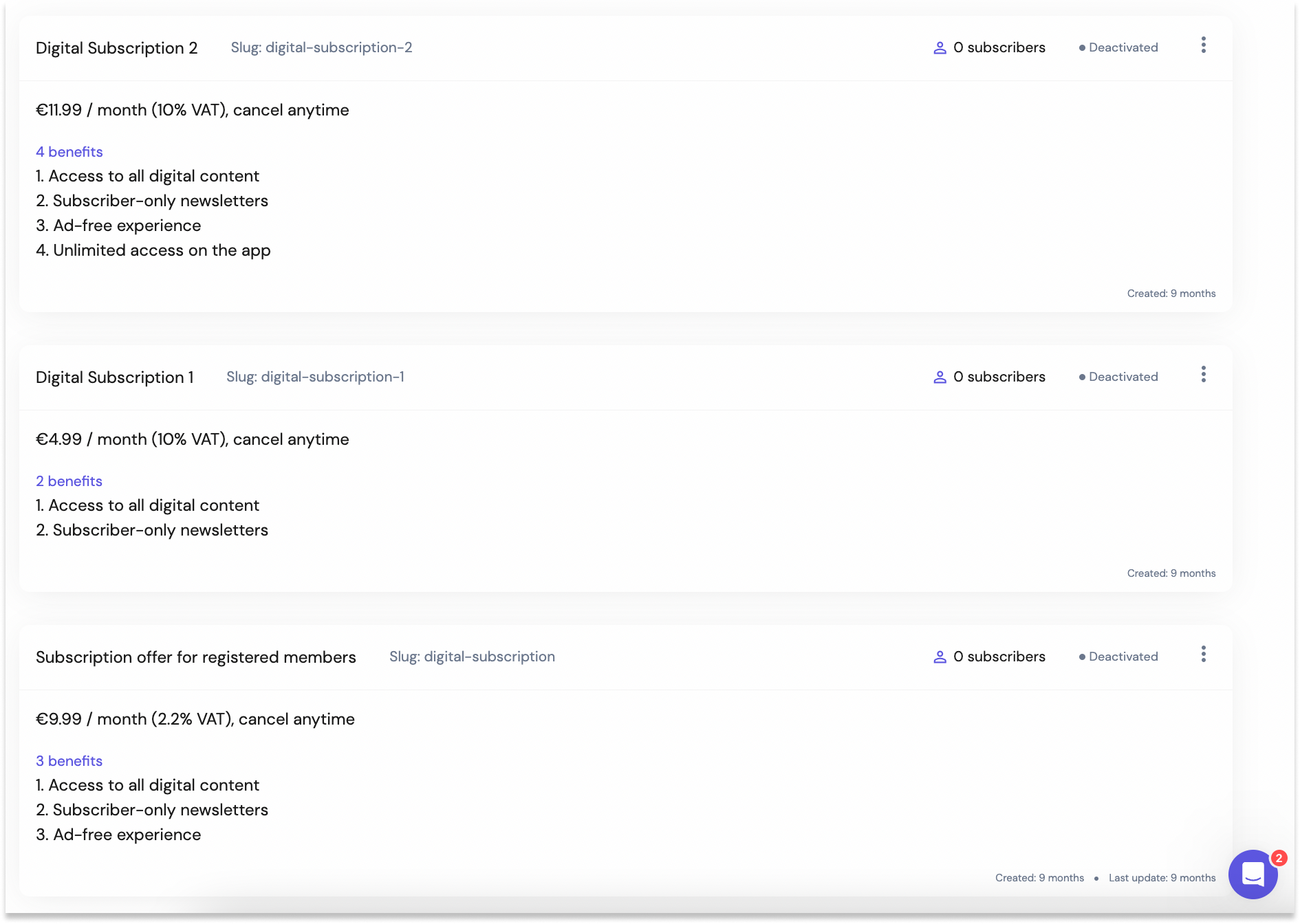 You can create different tiers of offers (Digital Subscription 1 & 2 here) and you can also create offers for a specific audience segment, with personalized benefits and adapted pricing. For instance, a Subscription offer for registered users.