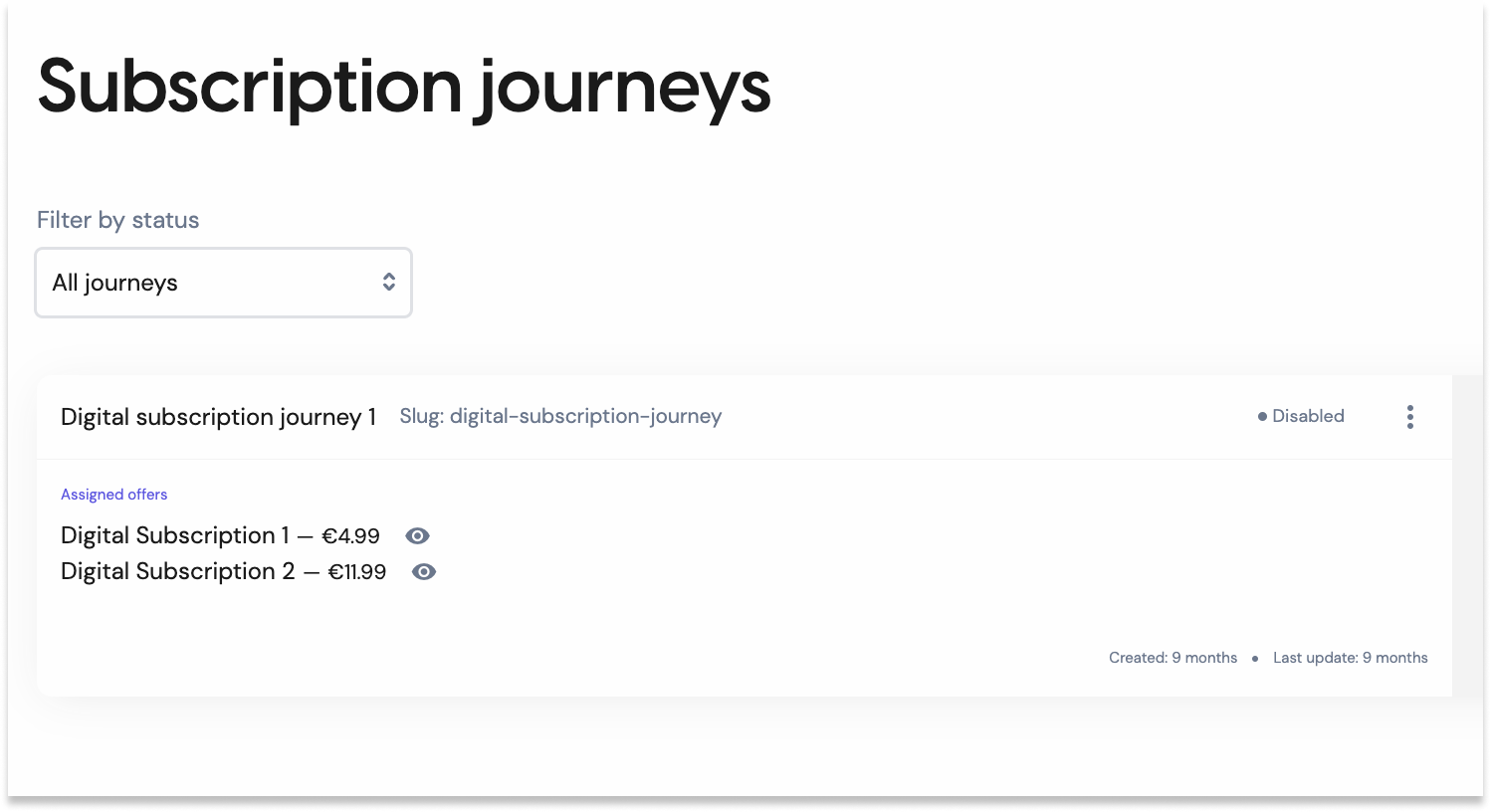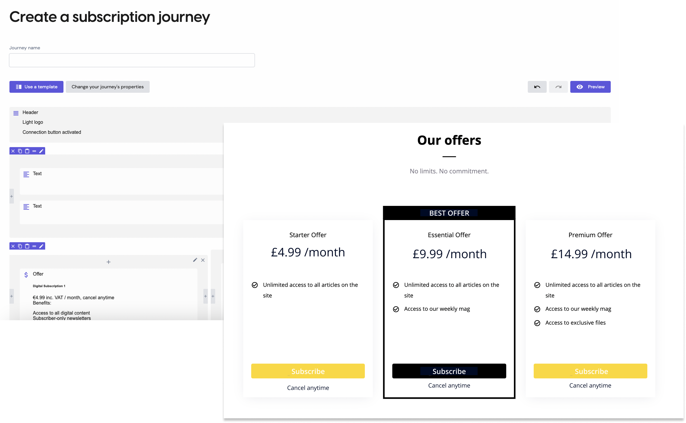The ‘Subscription journeys’ section of Subscribe is here for you to build your offers landing page (using your already-defined offers) as well as preview the account creation and payment steps in the funnel.