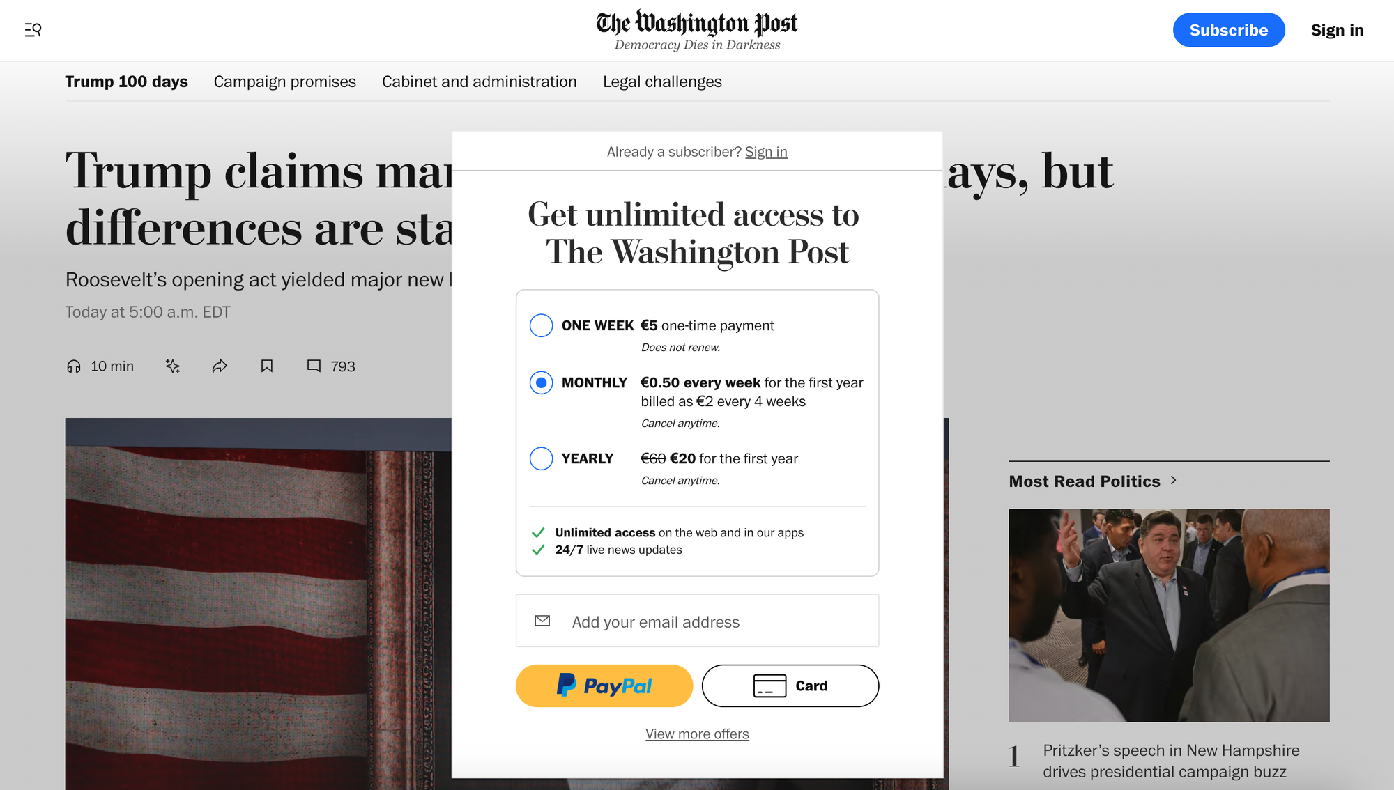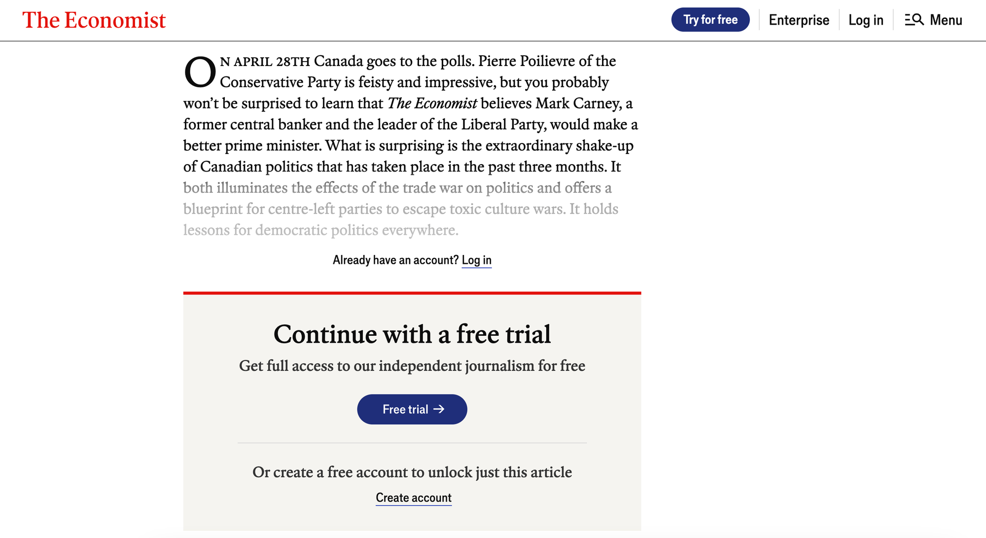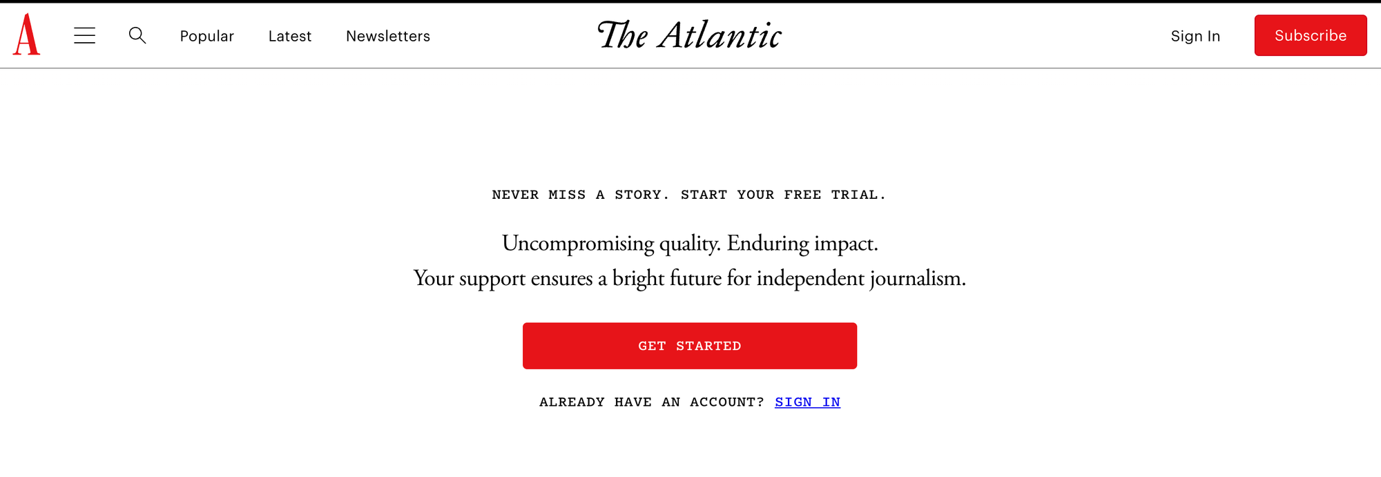 - Type de wall : D'abord un registration wall en pop-up complètement bloquant, puis un paywall pleine largeur.