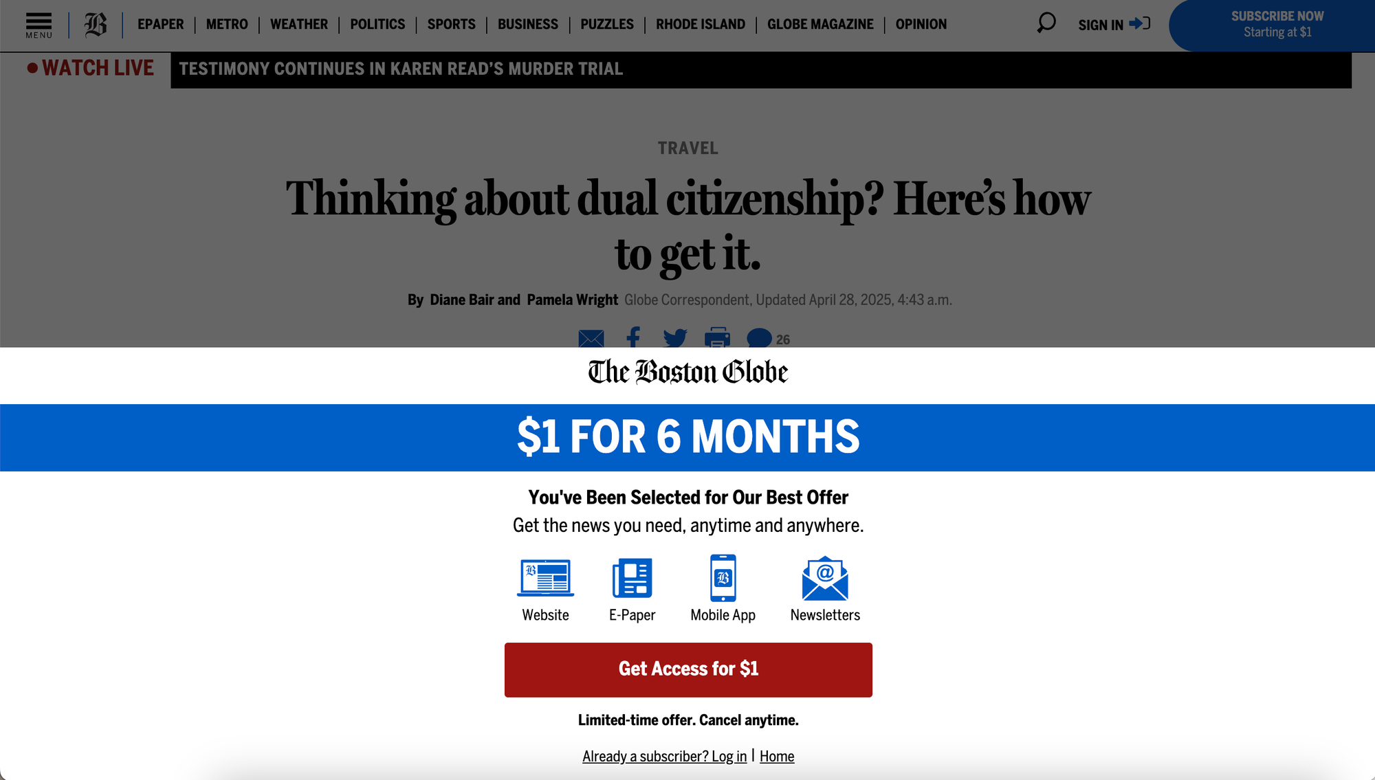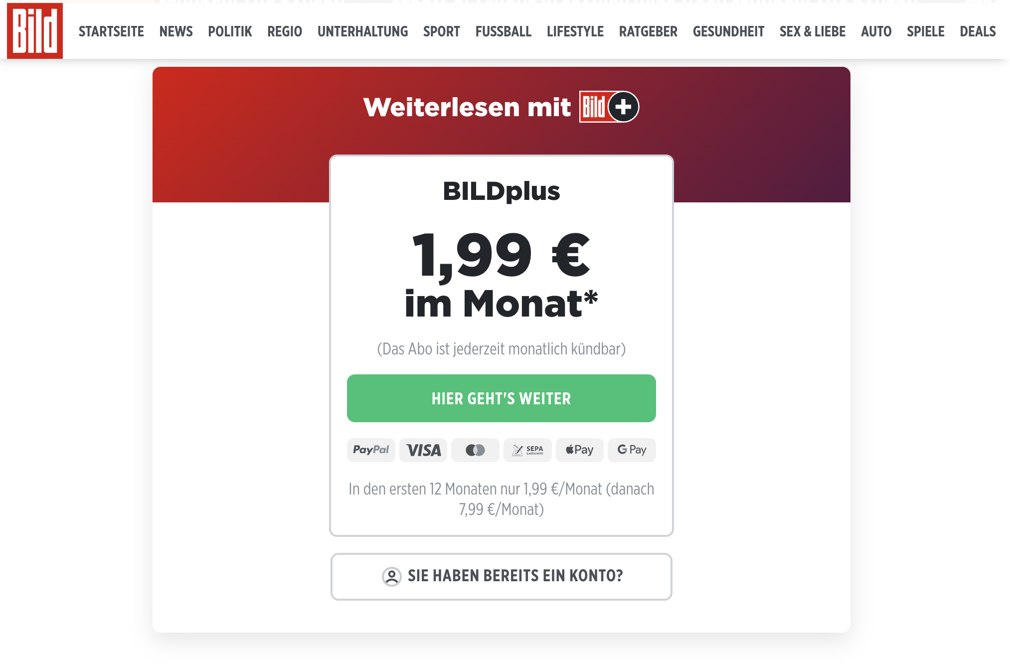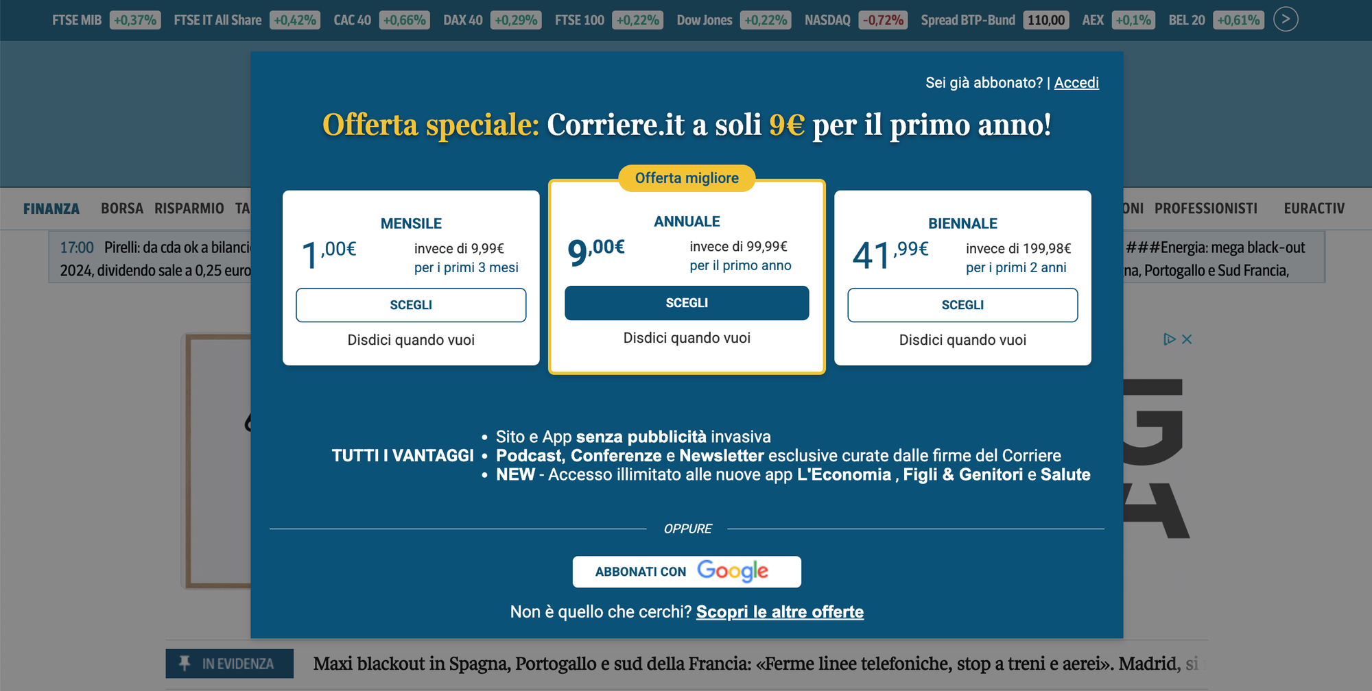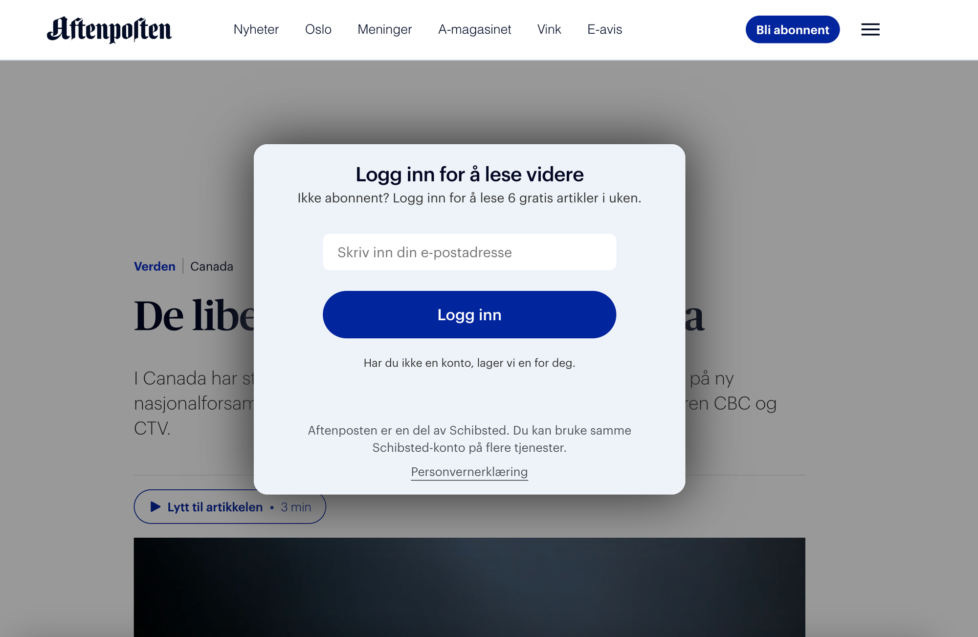 - Type de wall : D'abord un registration wall en pop-up complètement bloquant, puis un paywall pleine largeur.