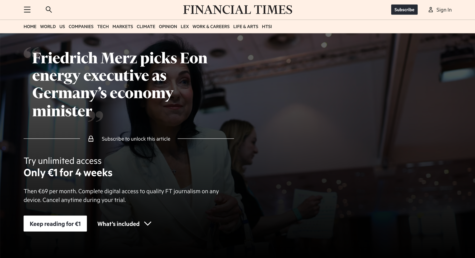 Le FT propose d'abord une petite fenêtre flottante en bas à gauche de l'écran invitant le lecteur à s'abonner, sans masquer le contenu de l'article. Puis au second article consulté, bloque complètement l'accès.