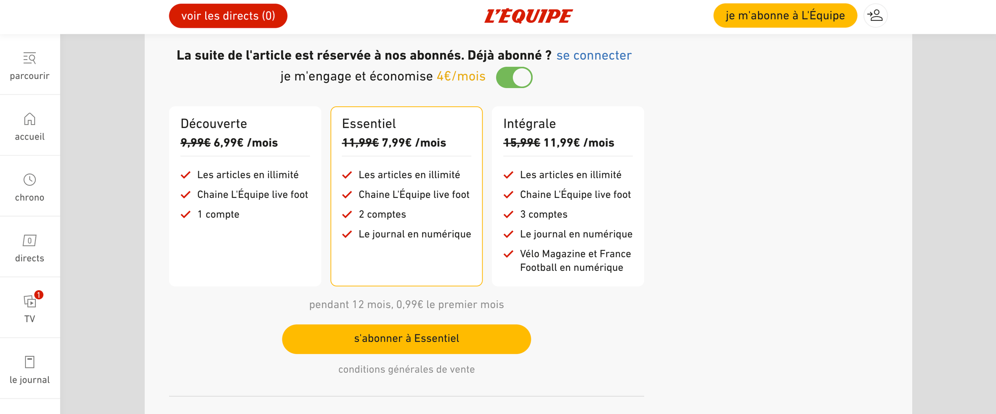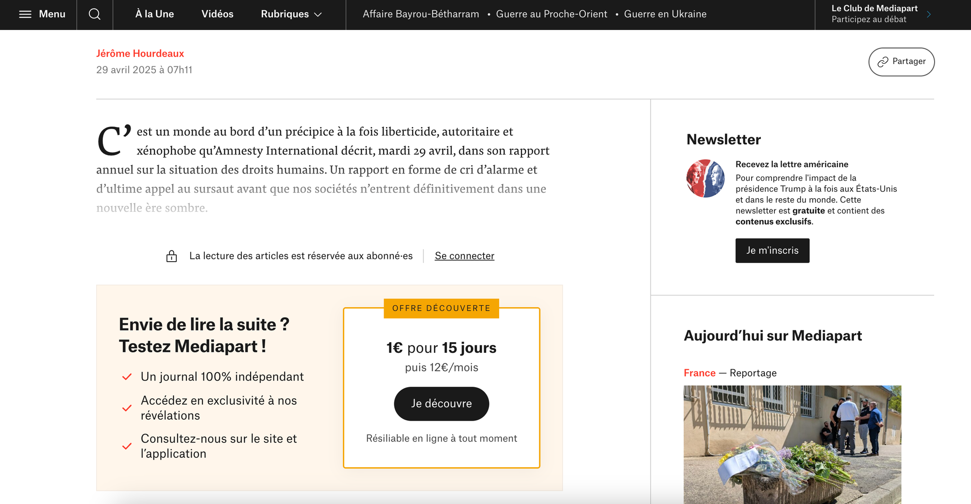 - Type de wall : Bandeau promo pour l'abonnement en pleine largeur, avec fenêtre promo en bas d'article mais aucun des deux ne masque le contenu ni ne bloque le scroll