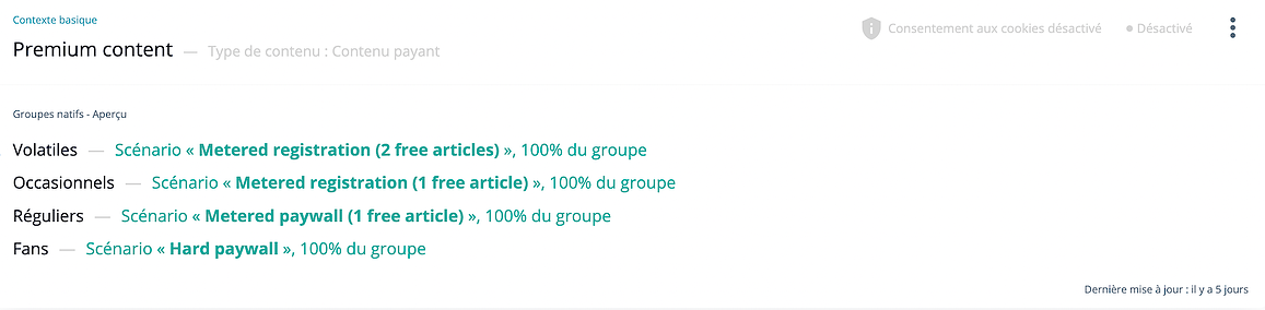 Dans l'exemple ci-dessous, nous avons choisi de guider les utilisateurs les moins engagés (Volatiles et Occasionnels) à travers un parcours de registration metered dans le but d'augmenter l'engagement et de collecter des données pour informer notre stratégie. Ces utilisateurs se voient alors offrir un ou deux articles gratuits avant de devoir créer un compte gratuit.
