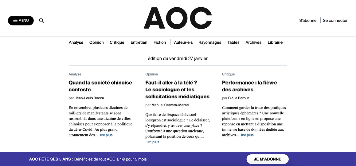 L'éditeur français AOC (Analyse Opinion Critique) a récemment ajouté une bannière au bas de sa page d'accueil et de son contenu pour promouvoir l'abonnement et son offre spéciale pour ses 5 ans d’existence