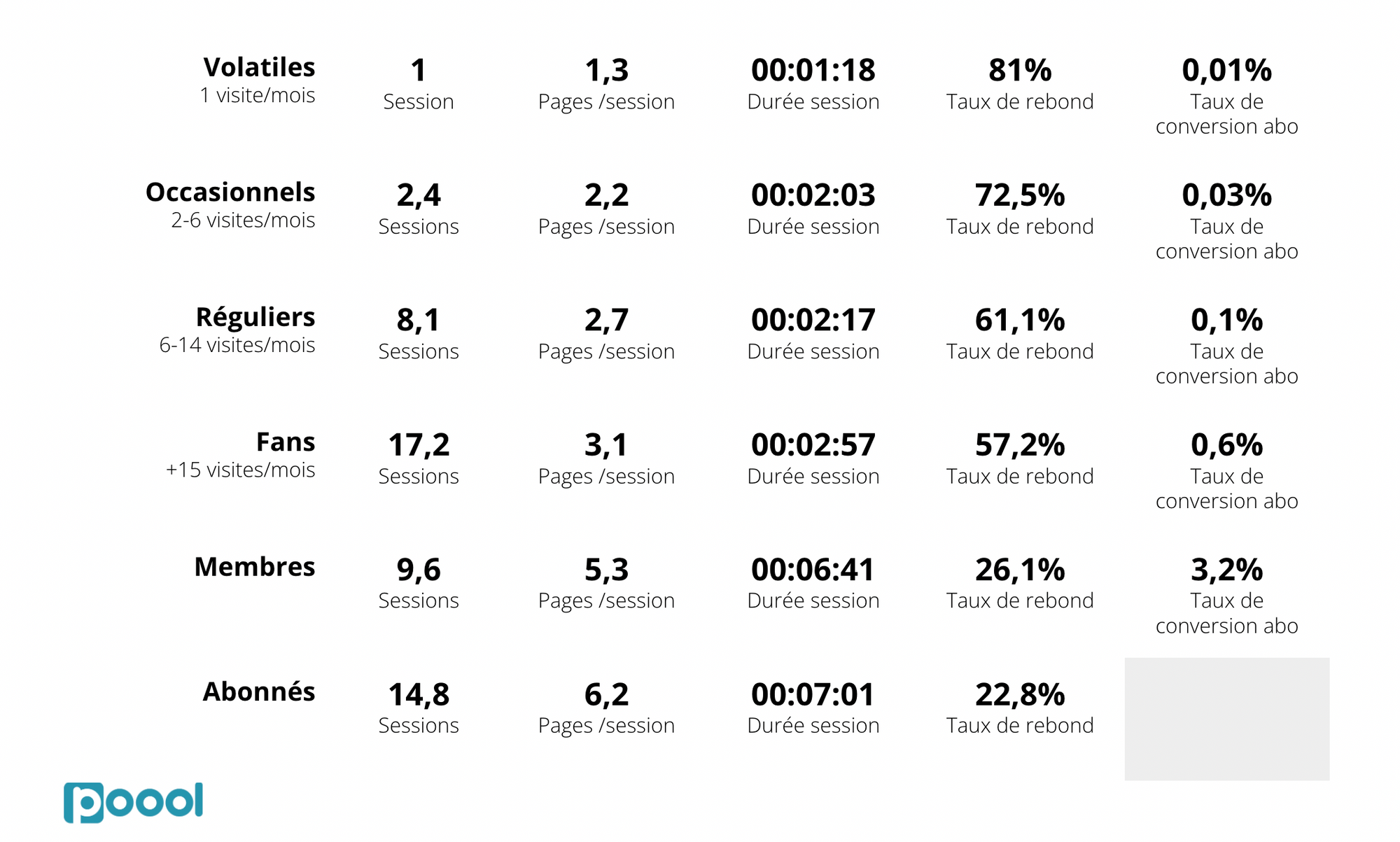 - Poool est une plateforme de conversion des audiences, qui permet aux producteurs de contenu en ligne de convertir leurs visiteurs anonymes en leads, membres et clients grâce à sa technologie de Paywall, Registration Wall et Cookie Wall avec alternative. Ecrivez-nous ici (en français ou anglais) !