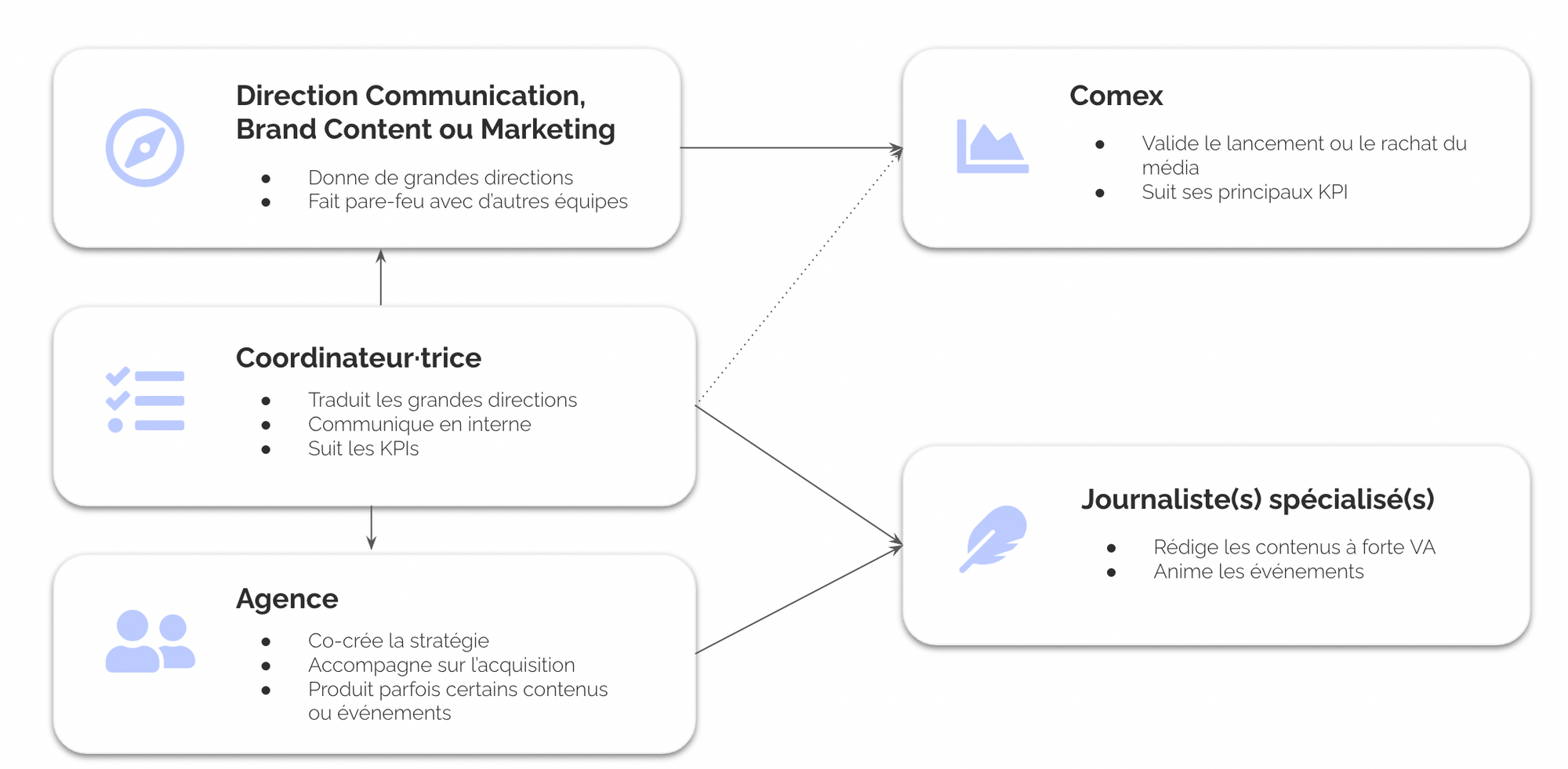 On remarque que, au fil du temps, les équipes de médias de marques se structurent souvent de la même façon :