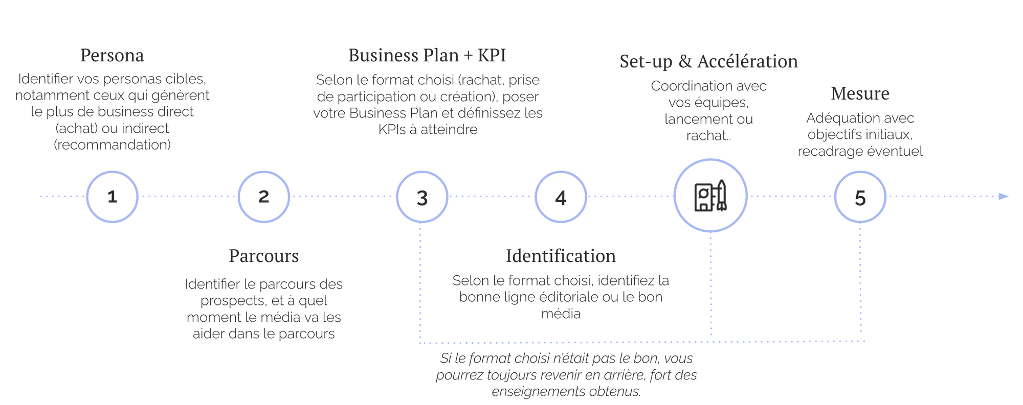 - Etape 3 : Décision sur le format de lancement : créer un nouveau média de zéro, ou en racheter un existant ? Selon l'option choisie, posez votre business plan et définissez vos KPIs à piloter