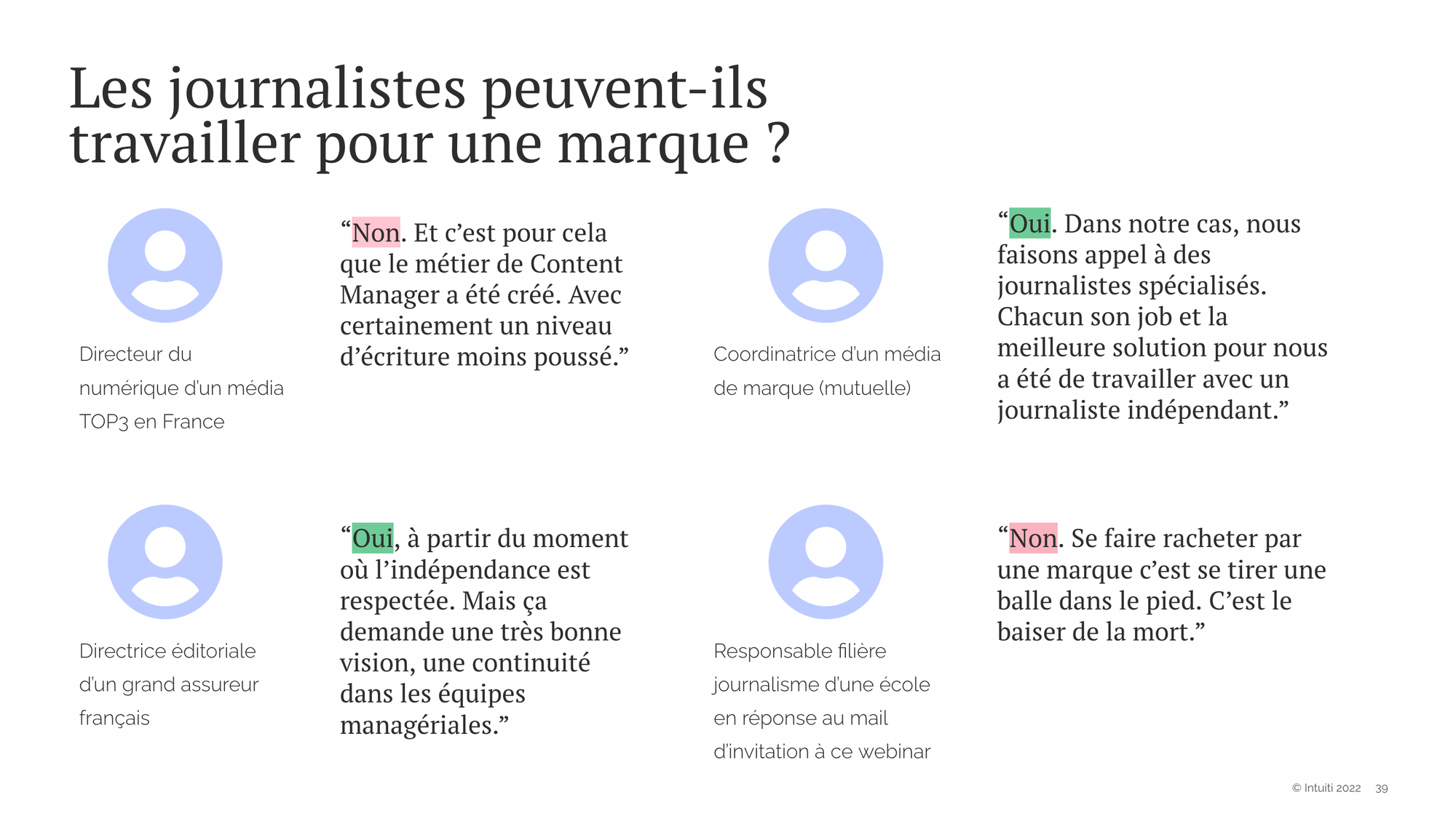 La question d'embaucher de "vrais" journalistes pour son média de marque se pose ensuite. Dit-on d'ailleurs dans ce cas-là "journaliste" ou "producteur de contenu" Nous avons posé la question à nos interlocuteurs...