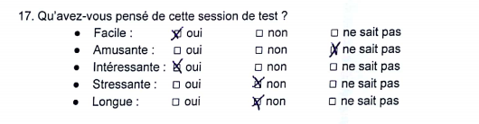 Cela peut aussi être l’occasion d’obtenir l’avis du participant sur des éléments “hors-test”, comme une variation de graphisme, d’autres pistes de recherche, ou comme je vous en ai parlé plus haut, le déroulé-même du test.