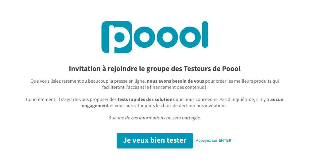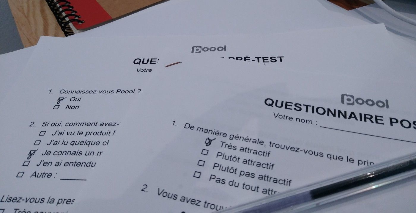 - mieux qualifier le profil du participant par rapport au contexte du produit testé (par exemple, chez Poool, c’est le moment de demander à la personne si elle a l’habitude de lire la presse, de lire la presse en ligne, d’utiliser des outils numériques…).