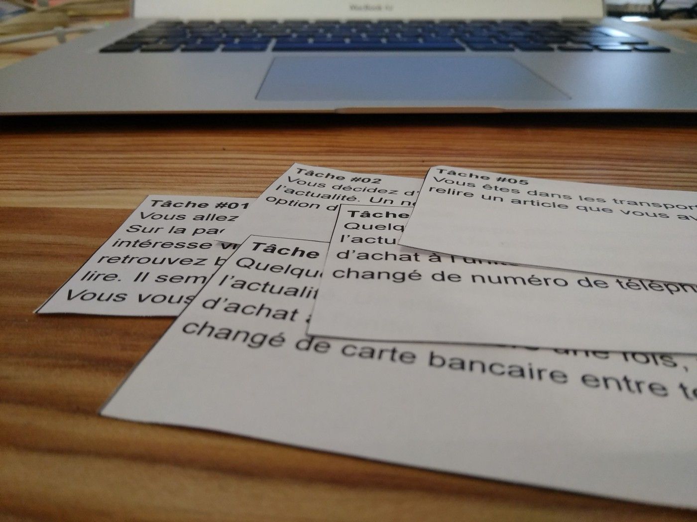 La question du matériel ne concerne pas que le matériel informatique. Prévoyez également des feuilles, des stylos et tous les supports complémentaires nécessaires à la bonne réalisation de votre scénario. Dans le cadre de sessions de tests, il m’est arrivé d’imprimer des faux SMS de confirmation sur des maquettes de smartphone ou de faire cartonner de fausses CB. Ces petits détails rendent le test beaucoup plus fluide.
