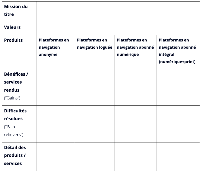 Voici une proposition pour écrire un premier jet de votre proposition de valeur: