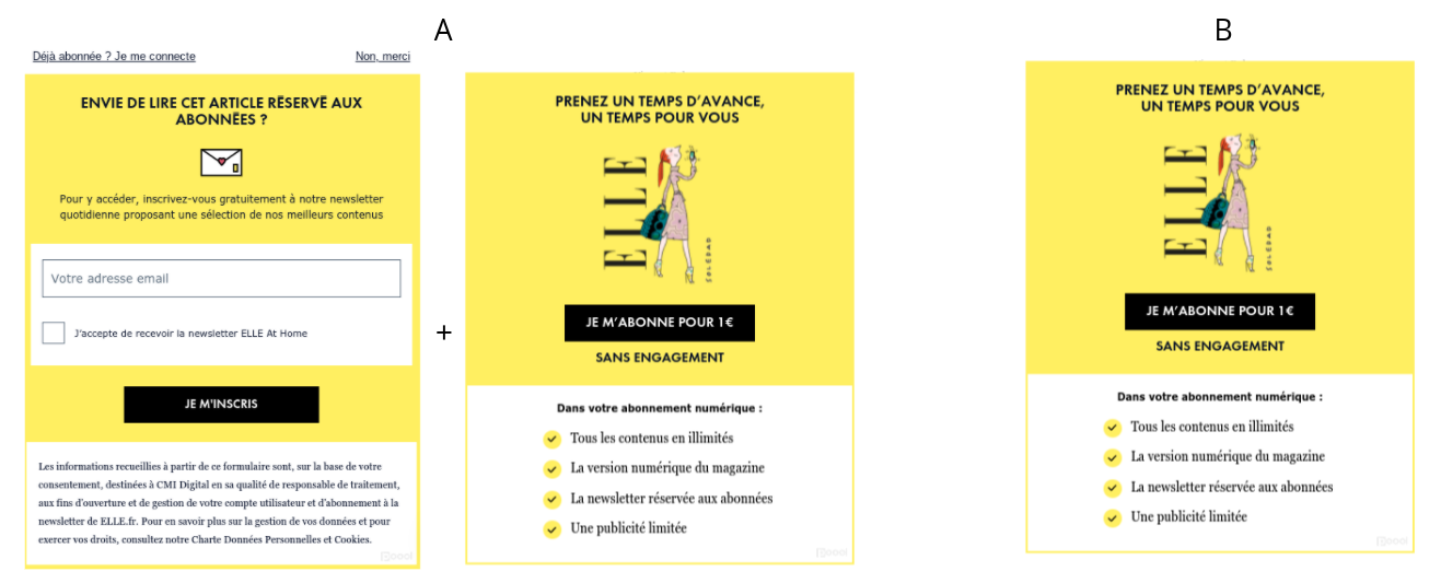Dans le cas de ELLE, bien que la version A ait très bien fonctionné pour le lancement de la stratégie, la collecte de données et l'augmentation de l'engagement avant l'abonnement, la version B a obtenu de meilleurs résultats lors de ce test. L’audience est donc, à cette étape de la stratégie d’abonnement, vraisemblablement plus engagée et moins frustrée par un paywall rigide.
