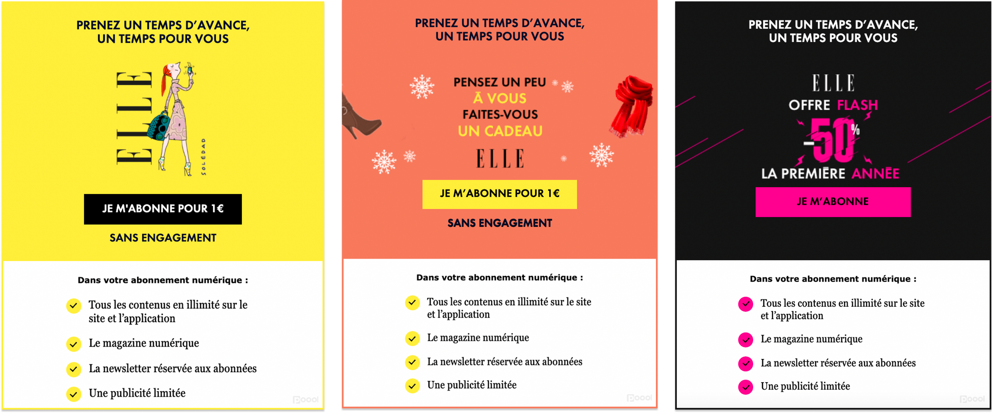 C’est prouvé : changer régulièrement l’apparence ou le wording de votre wall aura un impact positif sur les conversions. Les équipes de ELLE le savent bien et elles ont continué à effectuer des tests et à introduire des scénarios temporaires pour mettre en place des offres saisonnières afin de réduire l’accoutumance au wall. Les équipes créent de nouveaux design en fonction des saisons, des jours fériés ou ont même créé un wall pour le Black Friday.