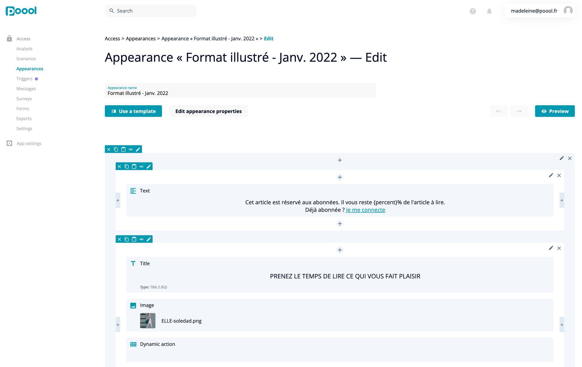 ELLE.fr a débuté par un datawall avant de passer à un paywall à partir de novembre 2020. ELLE.fr a pu passer de l’un à l’autre facilement grâce au Dashboard Poool qui permet d’intégrer tous types de wall dans tous types de parcours utilisateur sans avoir recours à l’équipe technique.