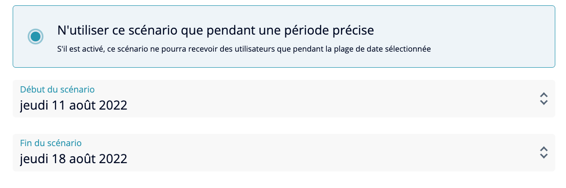 Les scénarios temporaires sont une fonctionnalité du Dashboard qui permet de tester un scénario et un design de wall sur une période limitée, par exemple pendant les soldes ou l’été comme l’a fait ELLE. Les dates de début et fin peuvent être configurées depuis le Dashboard :