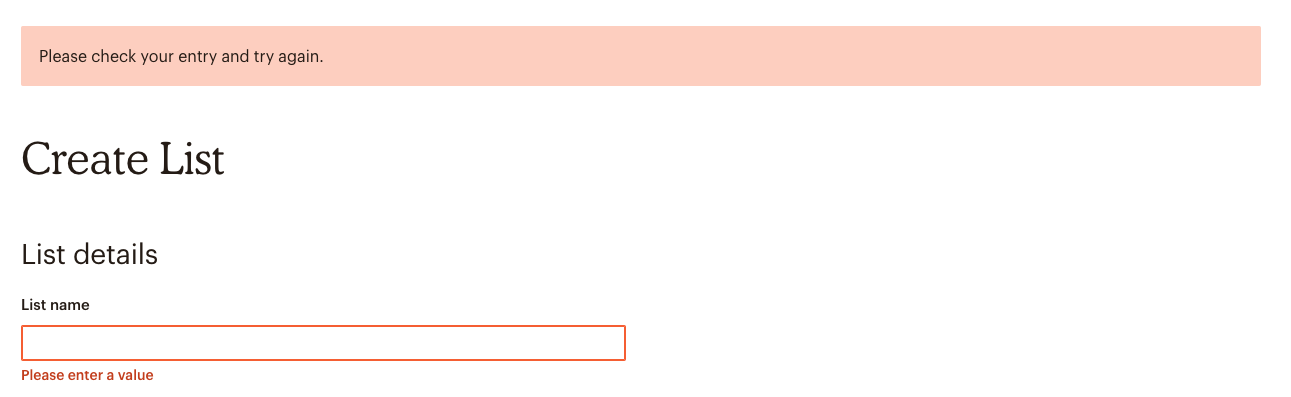 Un écran après, au moment de créer la liste, si j’oublie de renseigner le nom de la liste dans le formulaire dédié, Mailchimp affiche un message d’erreur lié au champ concerné. Il gère ainsi l’erreur de type “slip” que je viens de provoquer dans ce process de création de liste.