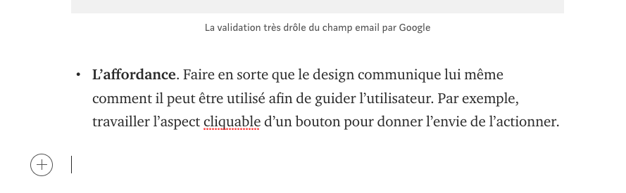 - L’affordance. Faire en sorte que le design communique lui même comment il peut être utilisé afin de guider l’utilisateur. Par exemple, travailler l’aspect cliquable d’un bouton pour donner l’envie de l’actionner.