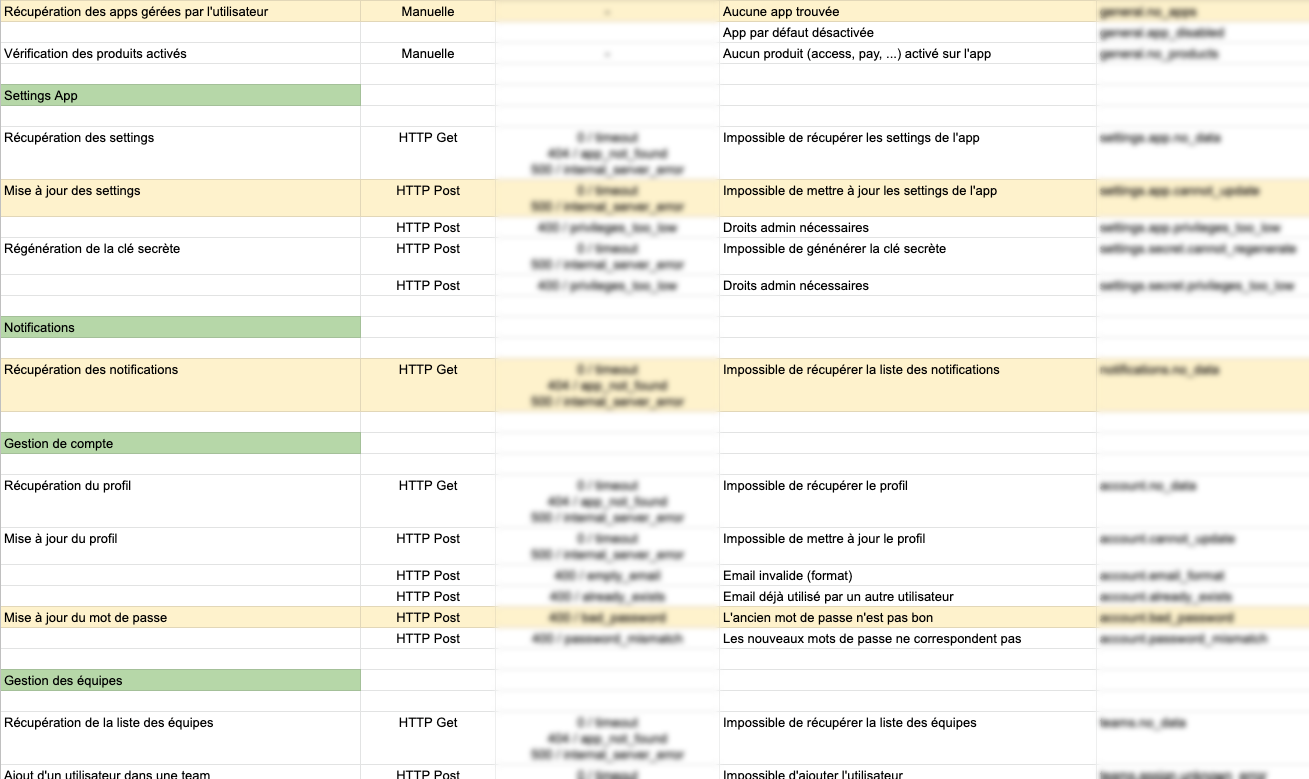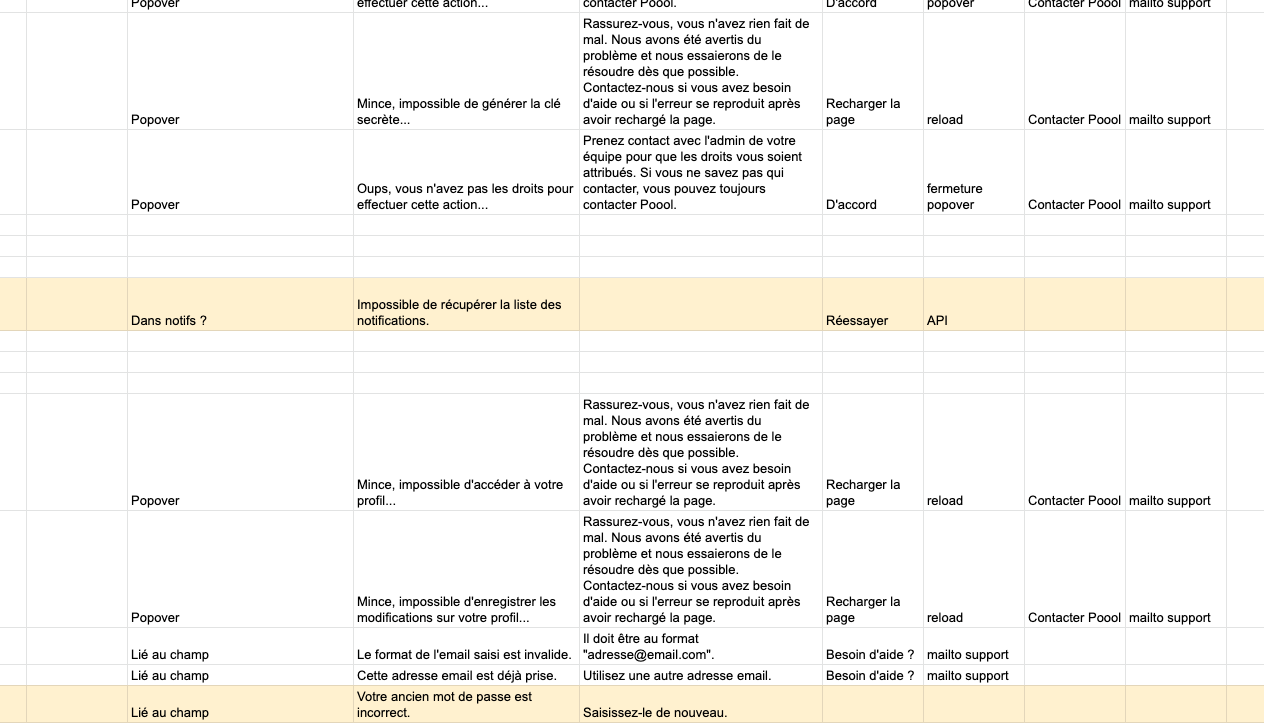 Mais il était devenu capital de travailler en équipe sur la problématique des messages d’erreurs. Ugo, notre CTO, a commencé par réaliser un listing précis des erreurs pouvant survenir sur notre Dashboard. Le principe était de connaître le type d’erreur et sa cause potentielle, le plus exhaustivement possible. Cela s’est matérialisé par un tableau de 114 erreurs potentielles.