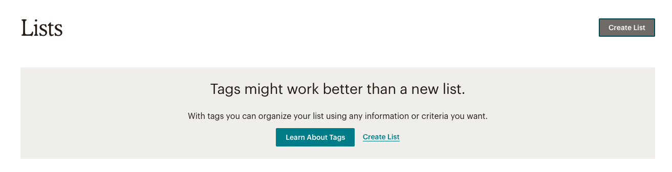 Dans son interface, Mailchimp nous donne un exemple concret de travail sur les “mistakes” et les “slips”. Au moment de cliquer sur le bouton “Create list”, l’outil me suggère l’utilisation d’une autre fonctionnalité, les “tags”, qui correspondent peut-être mieux au but que je recherchais… Mailchimp anticipe ainsi une mistake — très probablement courante dans leurs statistiques — en proposant un autre moyen d’action pour atteindre l’objectif.