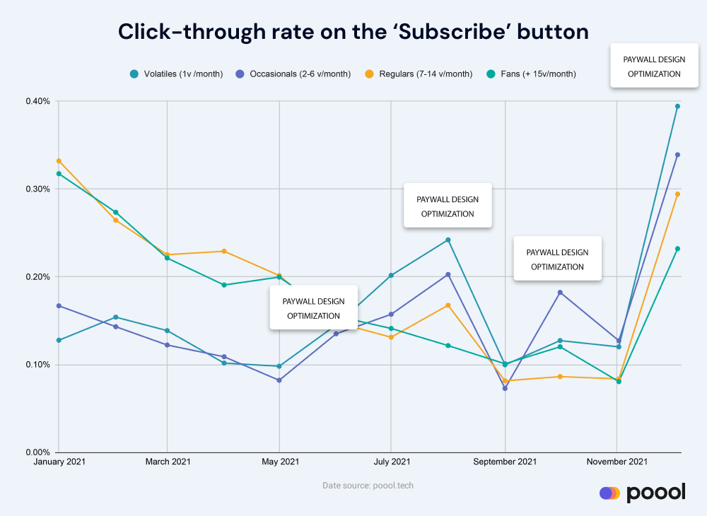 Ce résultat souligne l'importance de segmenter votre audience avant de procéder aux tests. Dans le cas de Bio à la Une, l'éditeur a utilisé le Dashboard de Poool pour segmenter les utilisateurs en fonction de leur niveau d'engagement (Volatiles, Occasionnels, Réguliers et Fans). Ainsi, l'éditeur a pu comprendre la réaction de chaque segment d'utilisateurs face au wording du paywall.