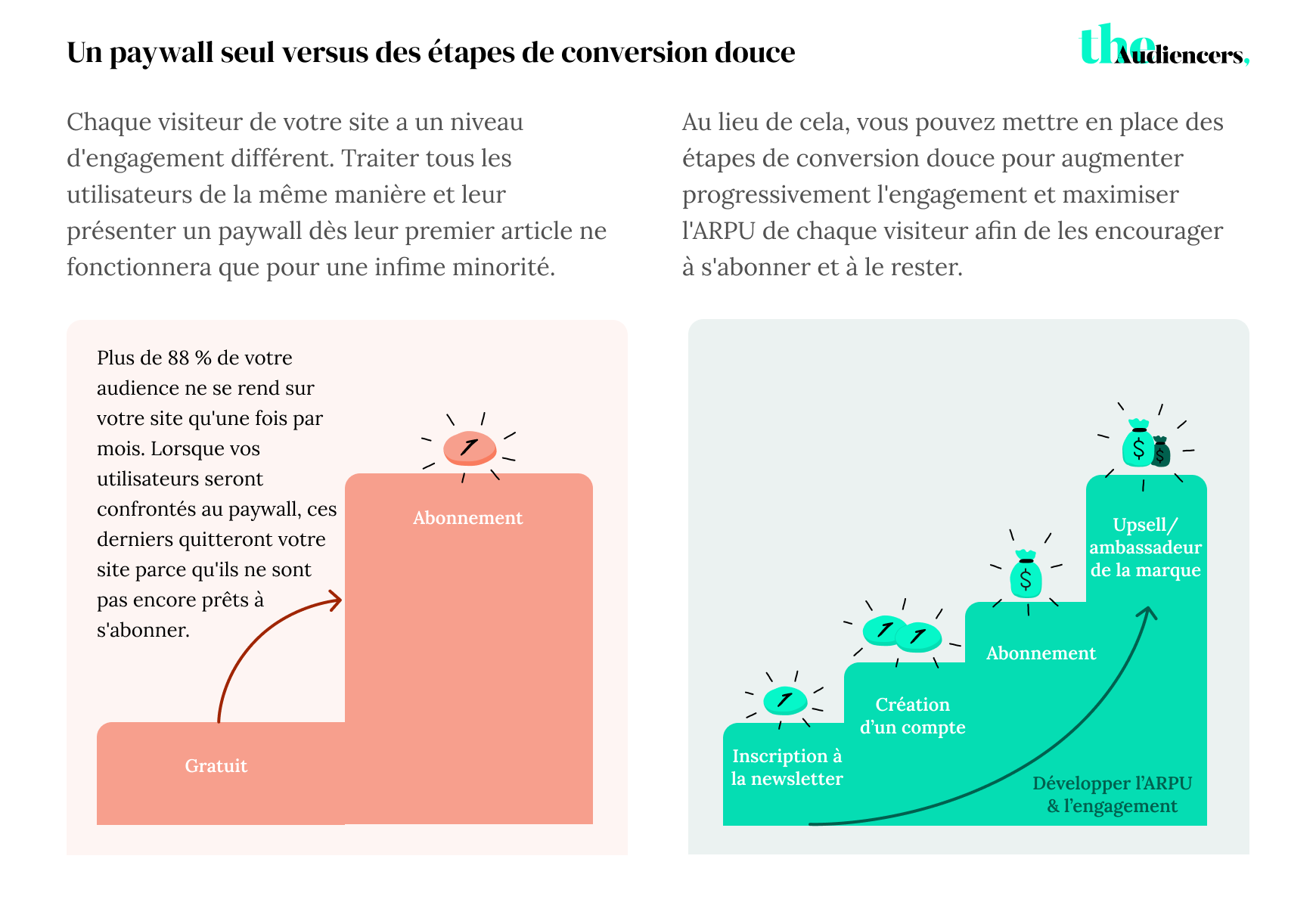 Les étapes de conversion douce, comme l'inscription à la newsletter, avant un hard paywall peuvent contribuer à optimiser les taux de conversion en augmentant l'engagement des utilisateurs (en particulier pour vos segments d'audience volatiles et occasionnels).