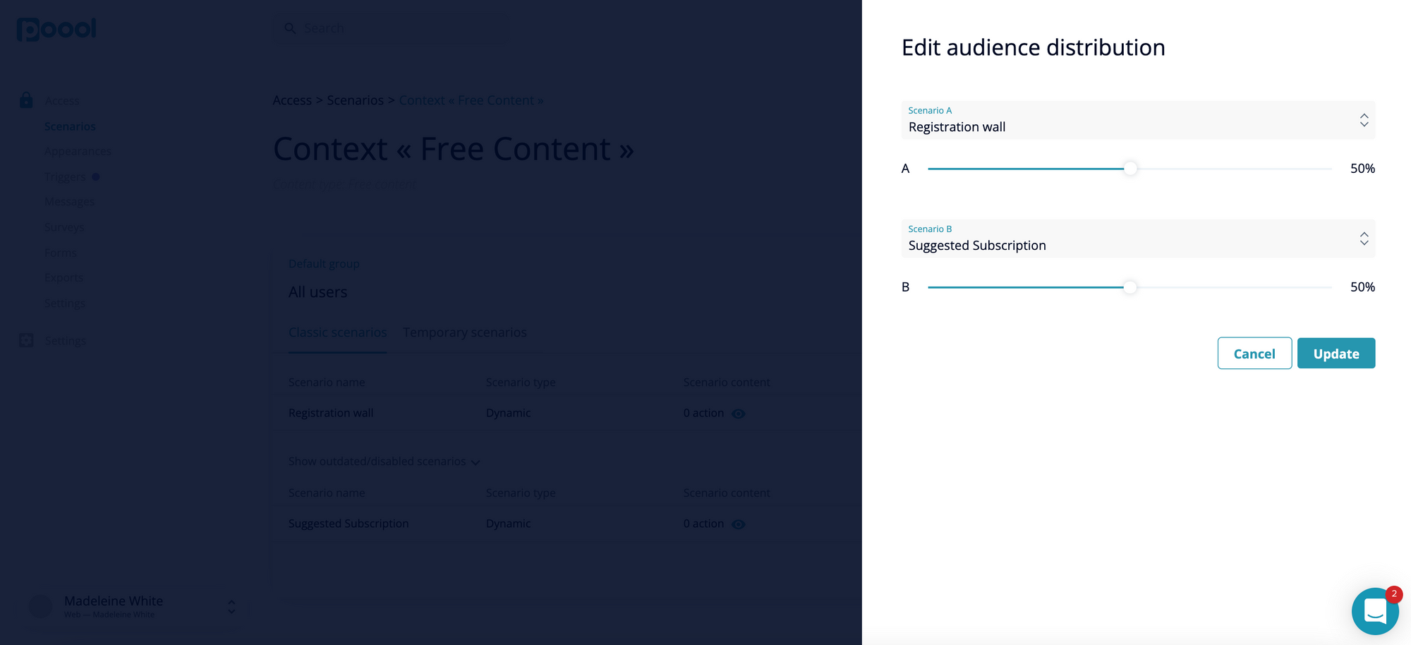 Launching an A/B test from the Poool Dashboard only takes a few minutes: you just need to activate two scenarios within the same audience group and slide the bar to specify the audience distribution (the percentage of your audience that will fall on version A or version B).