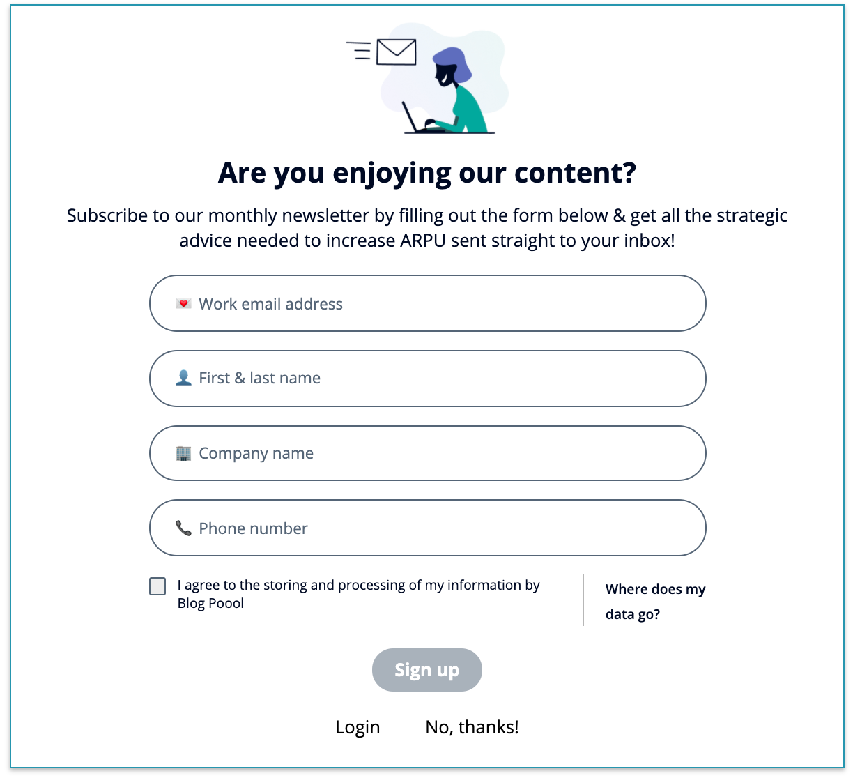 Using the Poool paywall platform and Dashboard, you can collect users email addresses in the paywall itself using the ‘Form’ widget. Remember that you can alter messaging and appearance of this widget in the relevant sections from the left and then by selecting the ‘Form’ widget as the one you want to modify.