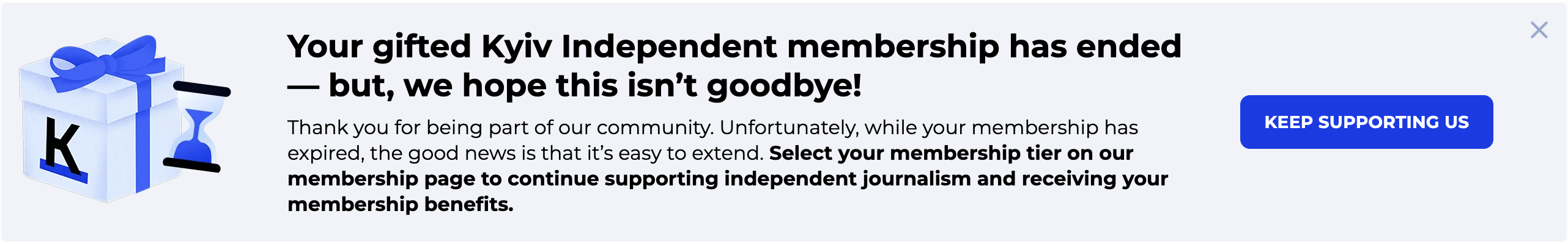 Inspired by The Guardian's support banner, the team at The Kyiv Independent have used Poool Engage to ask for one-off support or membership on the homepage, with a hard-hitting message that reflects the company's value proposition and mission.