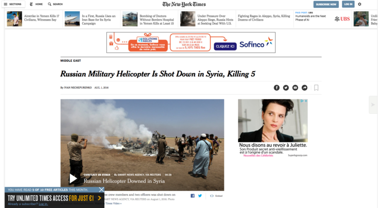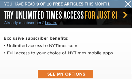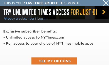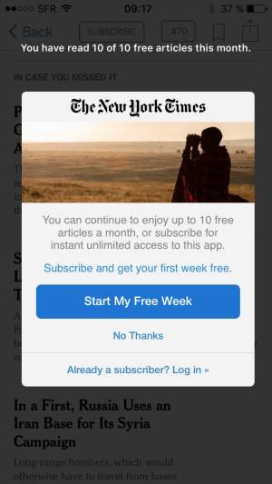 When you want to access your 5th article (no distinction on content type), the NYT displays a rather friendly message informing you that, as a loyal reader, you might be interested in subscribing, and so, you can discover the different options which are proposed to you. You also have the option to decline (“no thanks”).