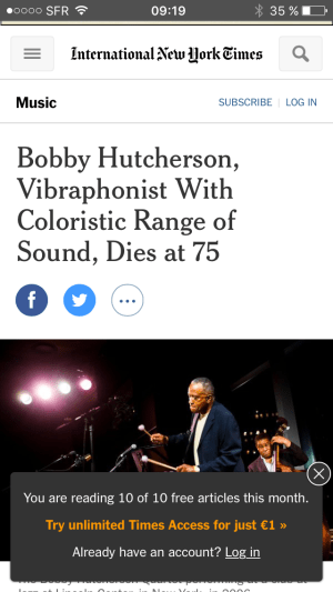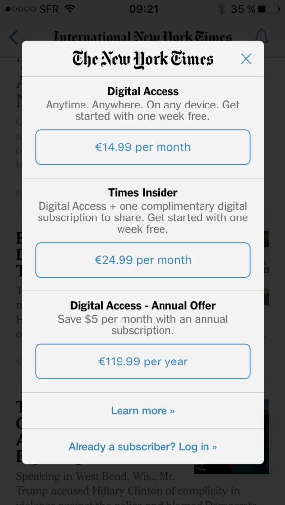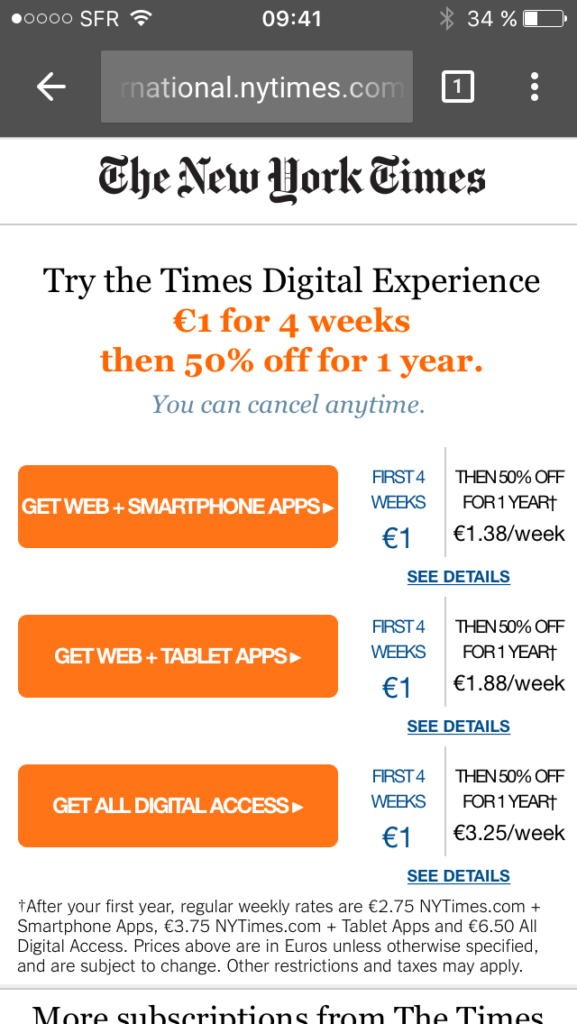Once blocked because you have consumed all your free items, the NYT logically offers you to subscribe. When you discover the offers of subscription, you can see that quite aggressive offers are offered (1 € the first month, less 50%, …). These offers aim to maximize the conversion rate to the subscription. It would still be interesting to know if the NYT could further improve its conversion rate and ARPU by customizing the price and promotional offers proposed according to the level of commitment of the reader. Would promotions be more effective if they were offered when necessary, and in an exclusive and limited way over time? Permanent promotion may in some cases lead to a feeling of degraded quality for the purchaser.